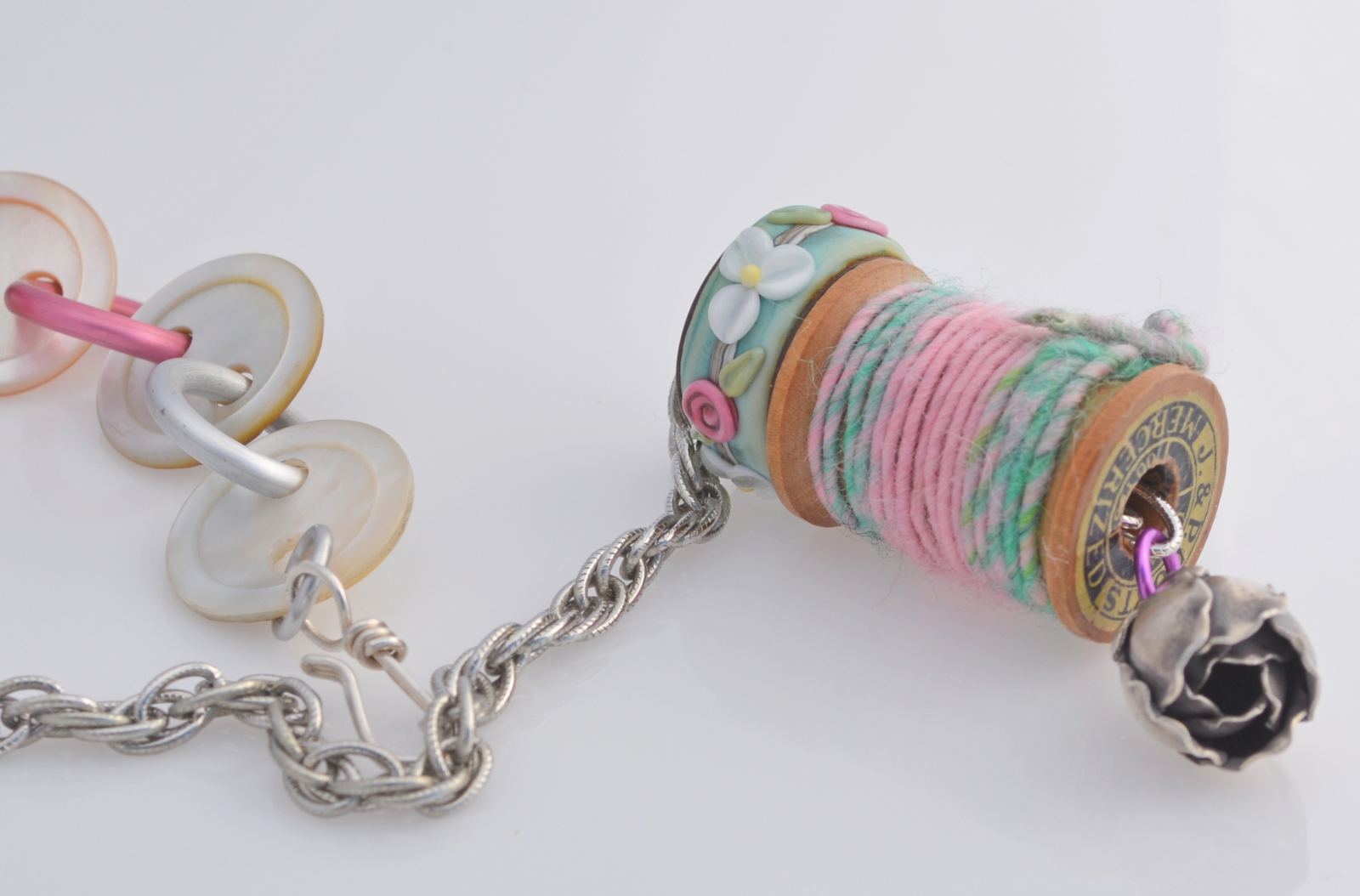 The pendant made from the wooden spool and bobbin lampwork freely slide on the chain. The beautiful sterling silver rosebud acts as a stopper at the end.