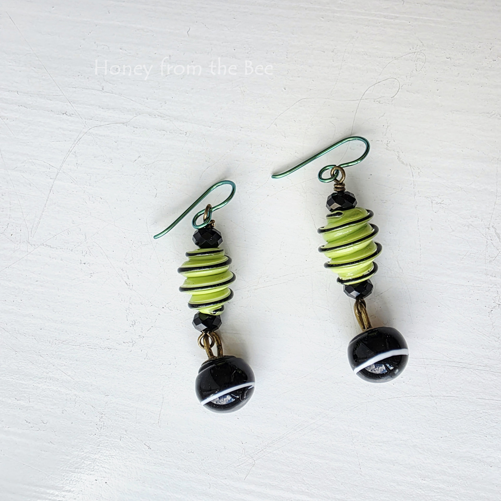 These fun earrings dangle 2.25" from the top of the earwire to the bottom of the button dangle.