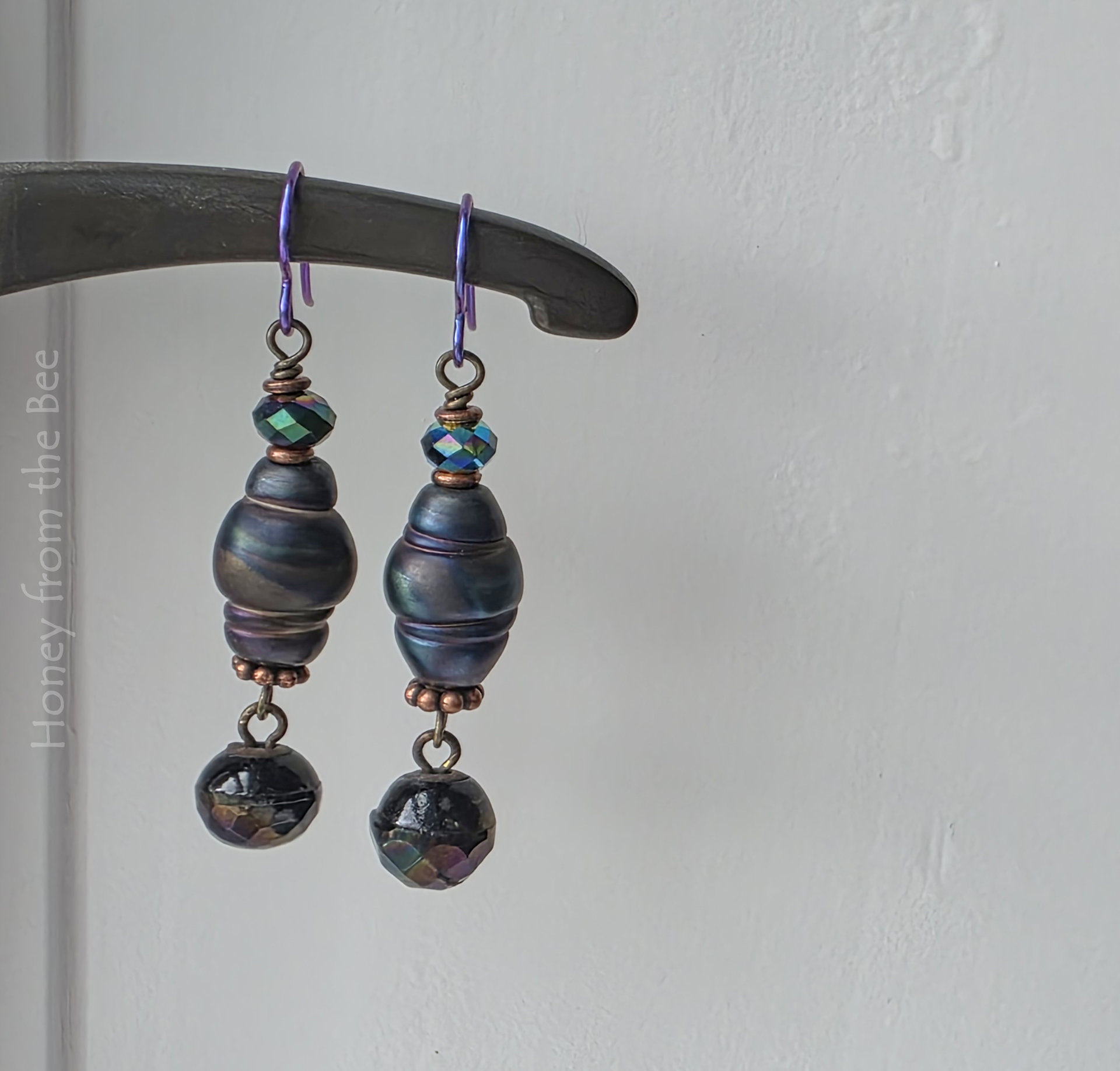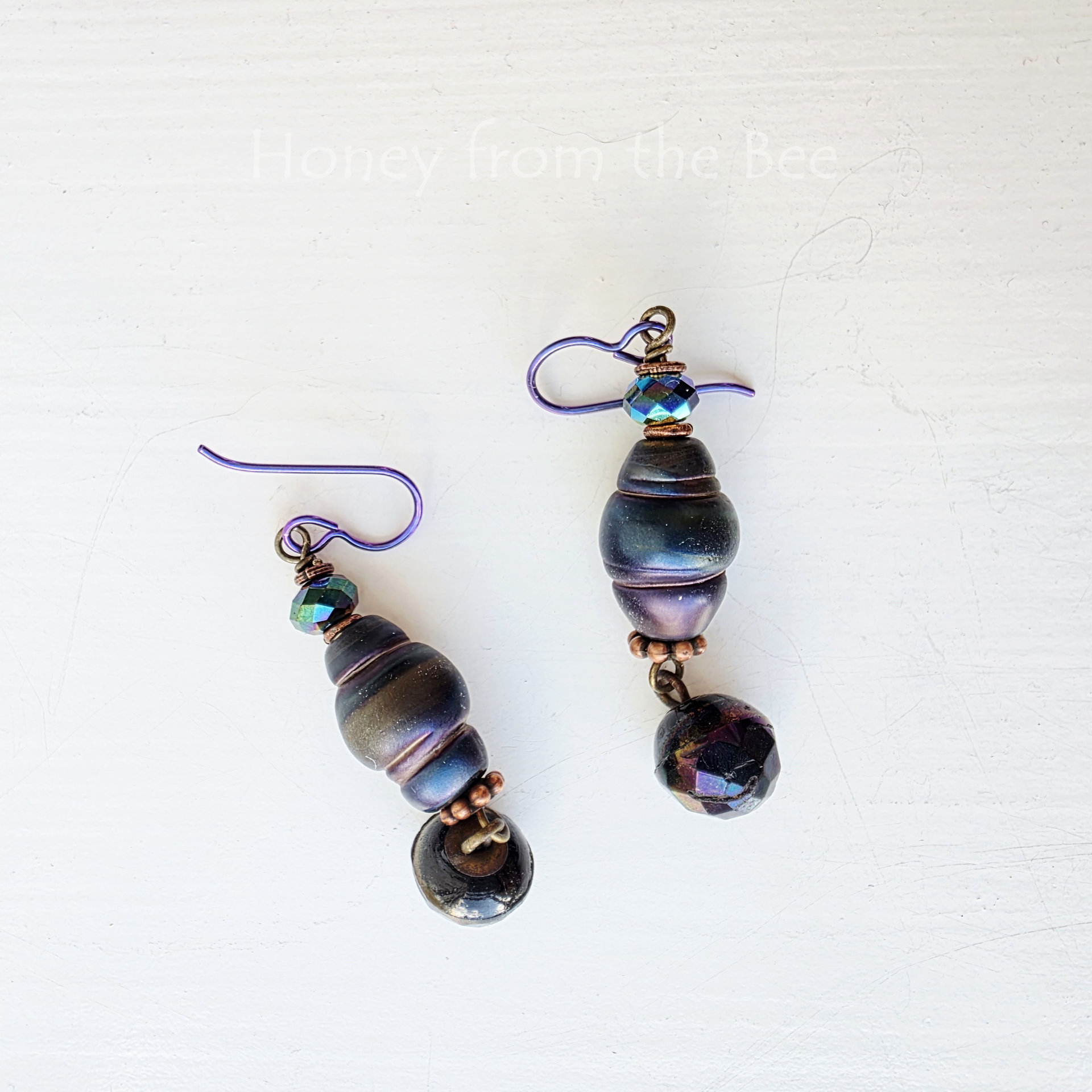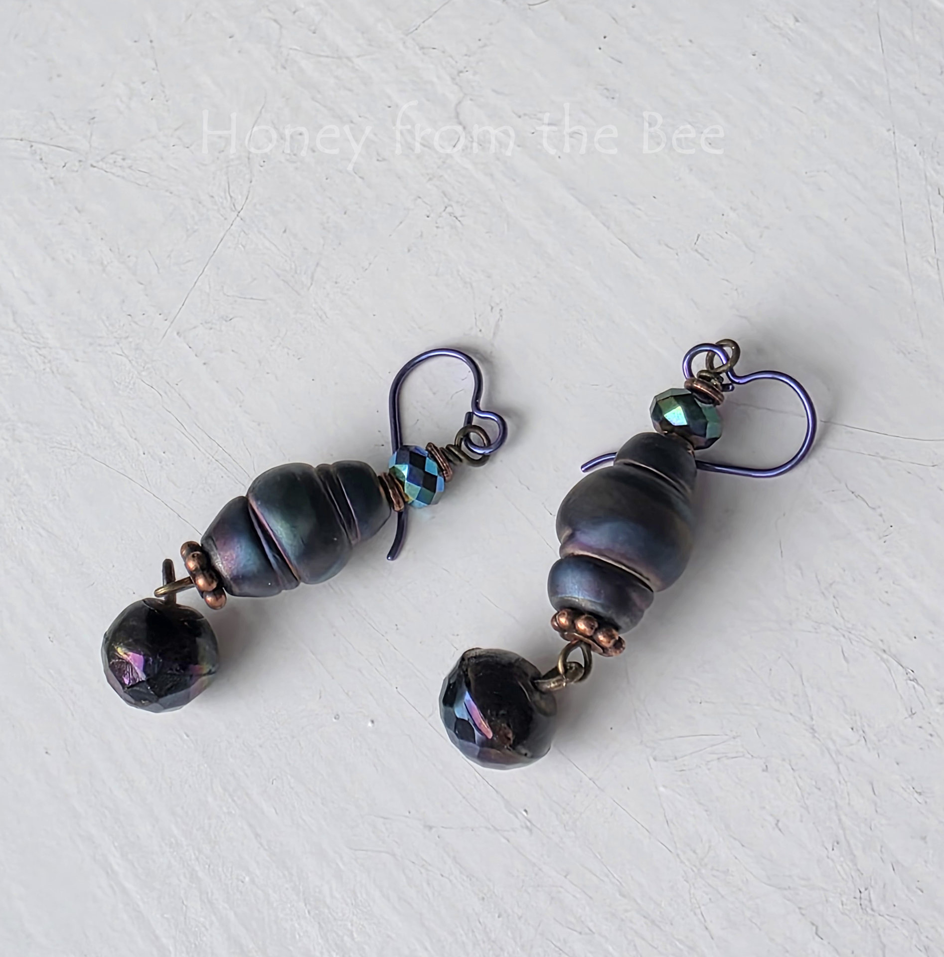 Gorgeous dark peacock colored lampwork and crystals make up these unique earrings.