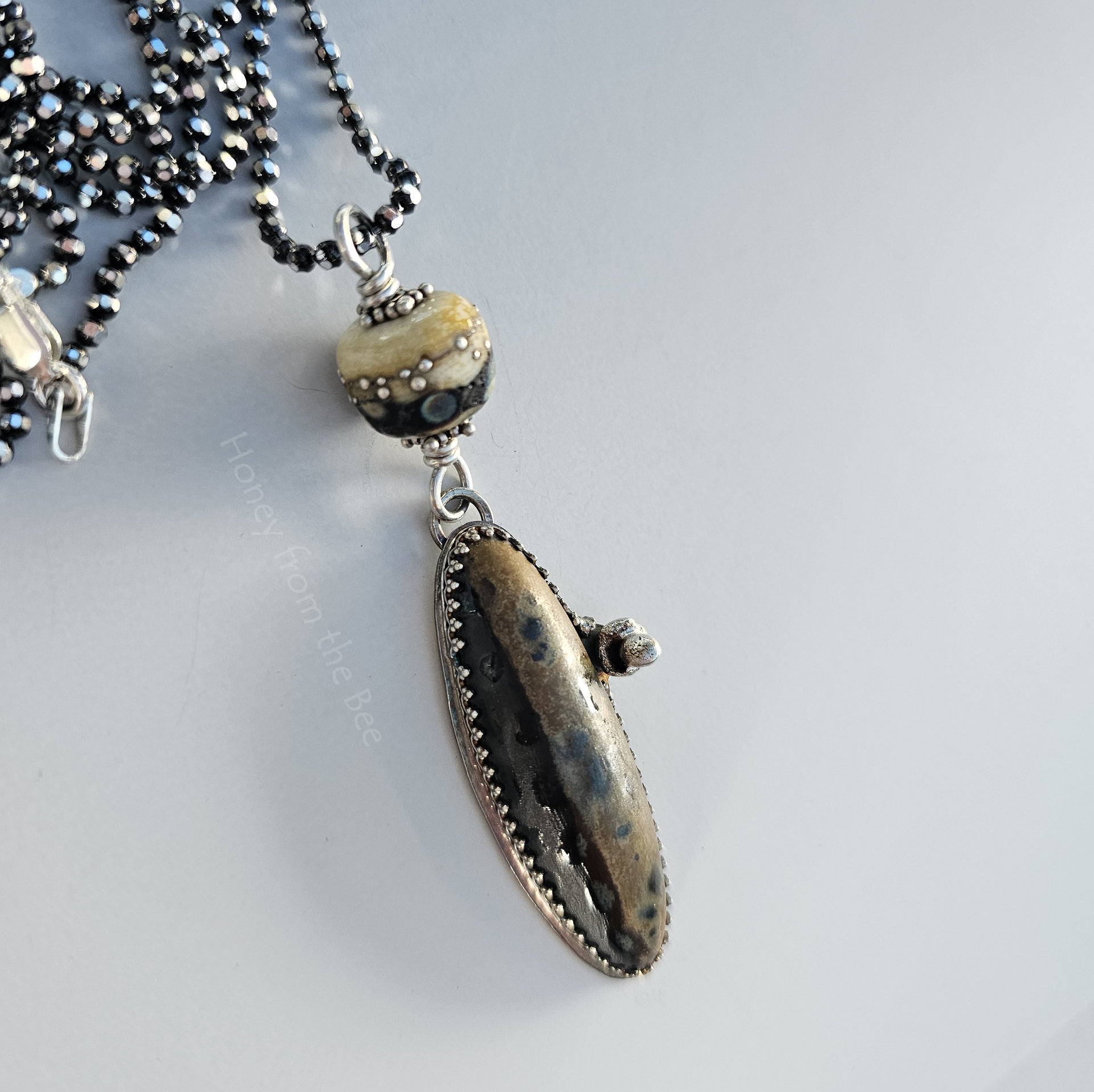 Artisan pendant features sterling silver captured ceramic by Lisa Peters Russ with a lampwork bead that just enhances the artistic appeal.