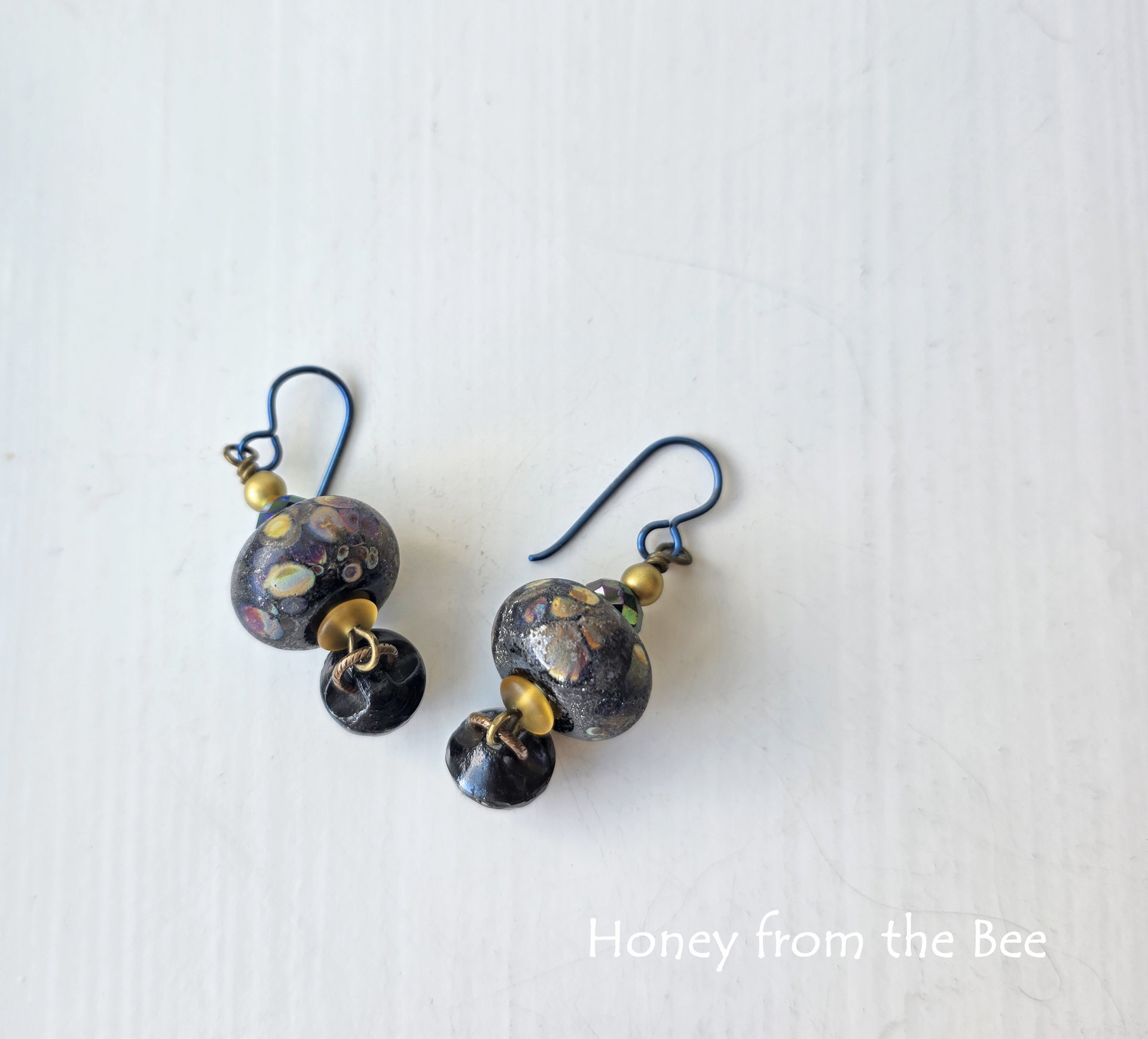 Under fire is how these lampwork beads were created. Not just a lampworker's flame, but then dropped in an oxygen deprived container which creates these wonderful reactions to the glass. It's called raku. I've added faceted antique buttons as drops and a beautiful peacock colored crystal, too.