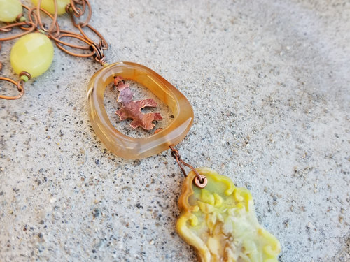 I patiently sawed a copper oak leaf out of copper sheet. I then forged it and gave it a patina and framed it in a carnelian agate frame, a gift from a friend that shares so much with me. I dangled a carved yellow opal with a natural theme. A chain of copper and faceted jade beads complete the picture.
