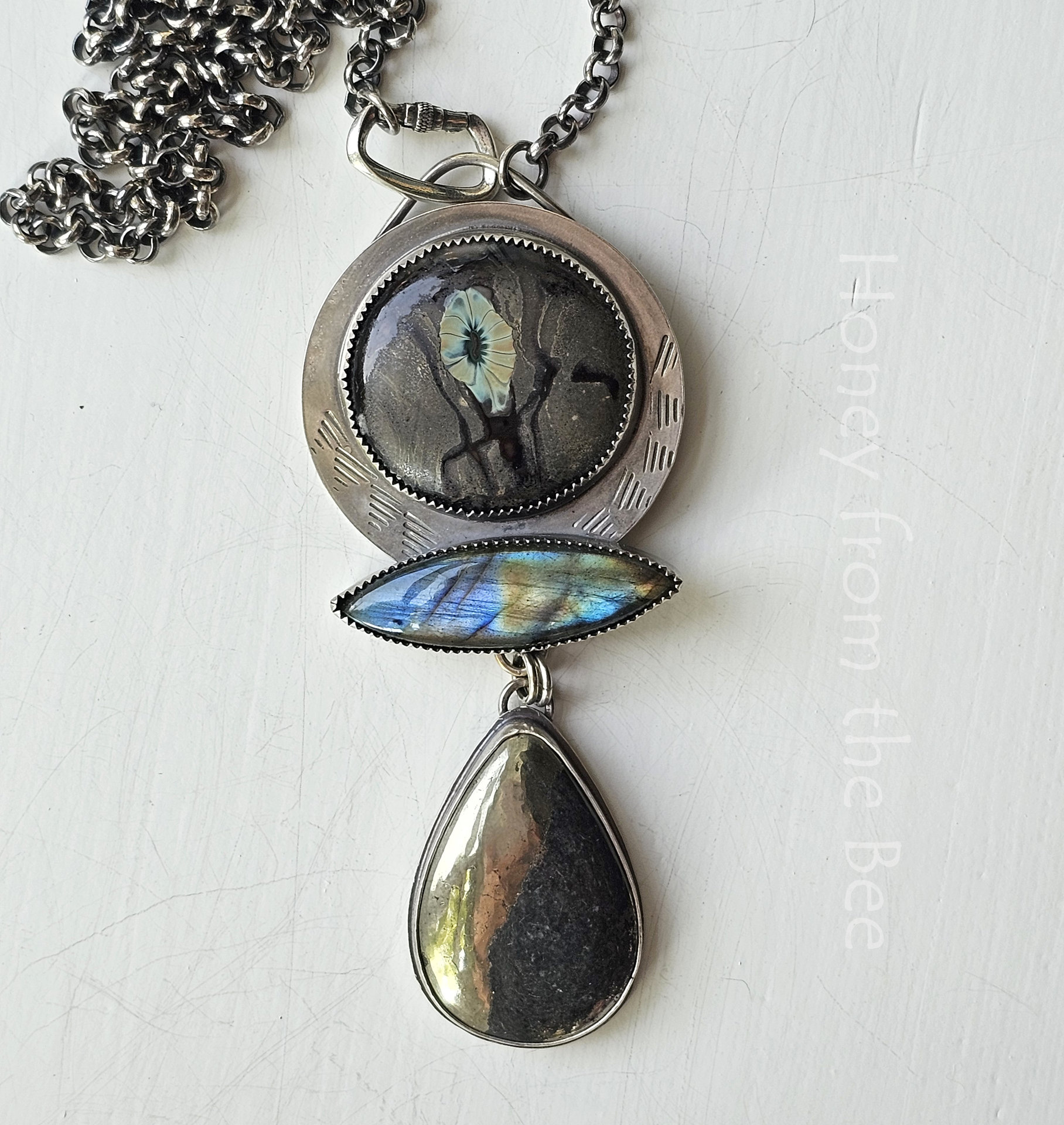 Pendant is 3.5" long x 1.5" at widest